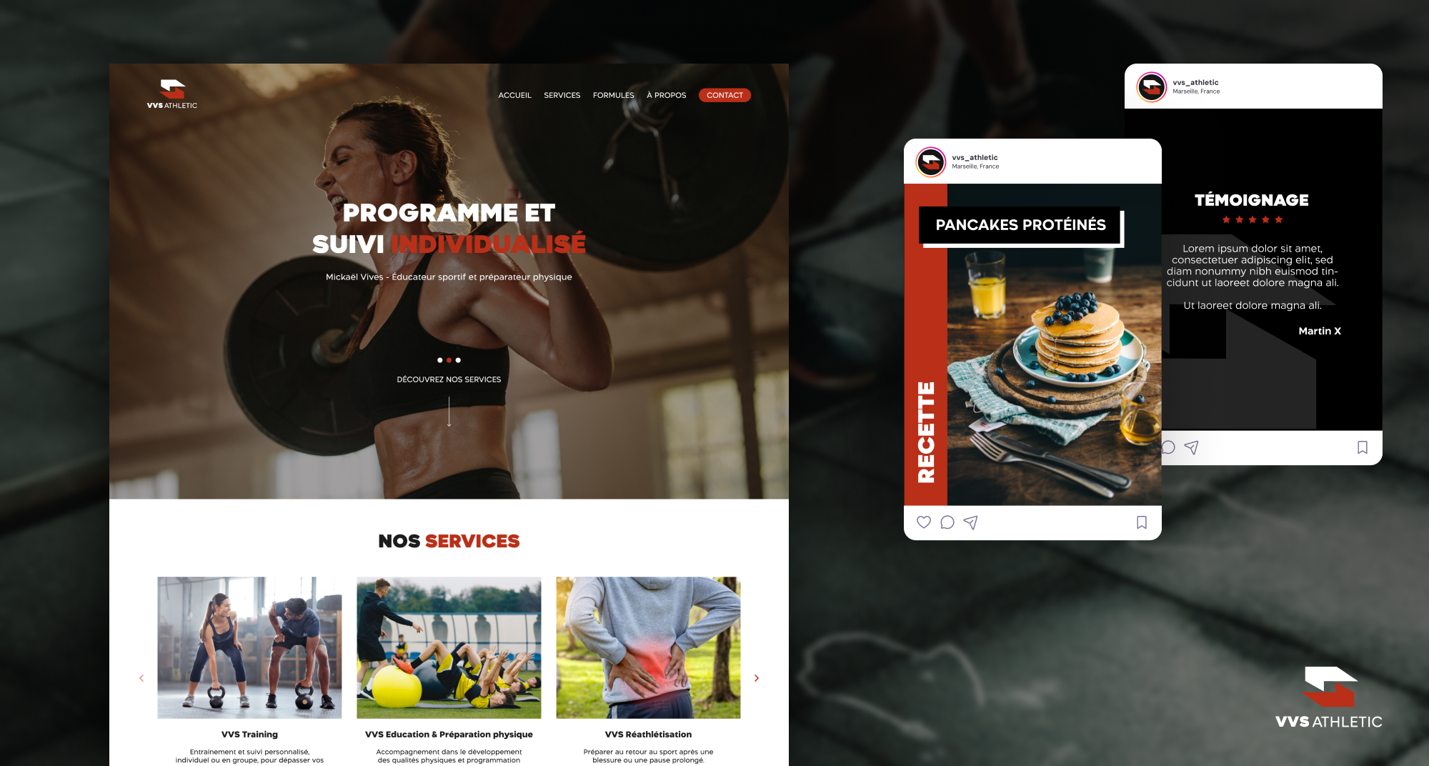 Mickaël Vives nous a contactés lors de la création de son activité de coach sportif. Il avait besoin de mettre en avant une identité visuelle qui peut être déclinée sur différents supports afin de créer une marque, VVS Athletic.
