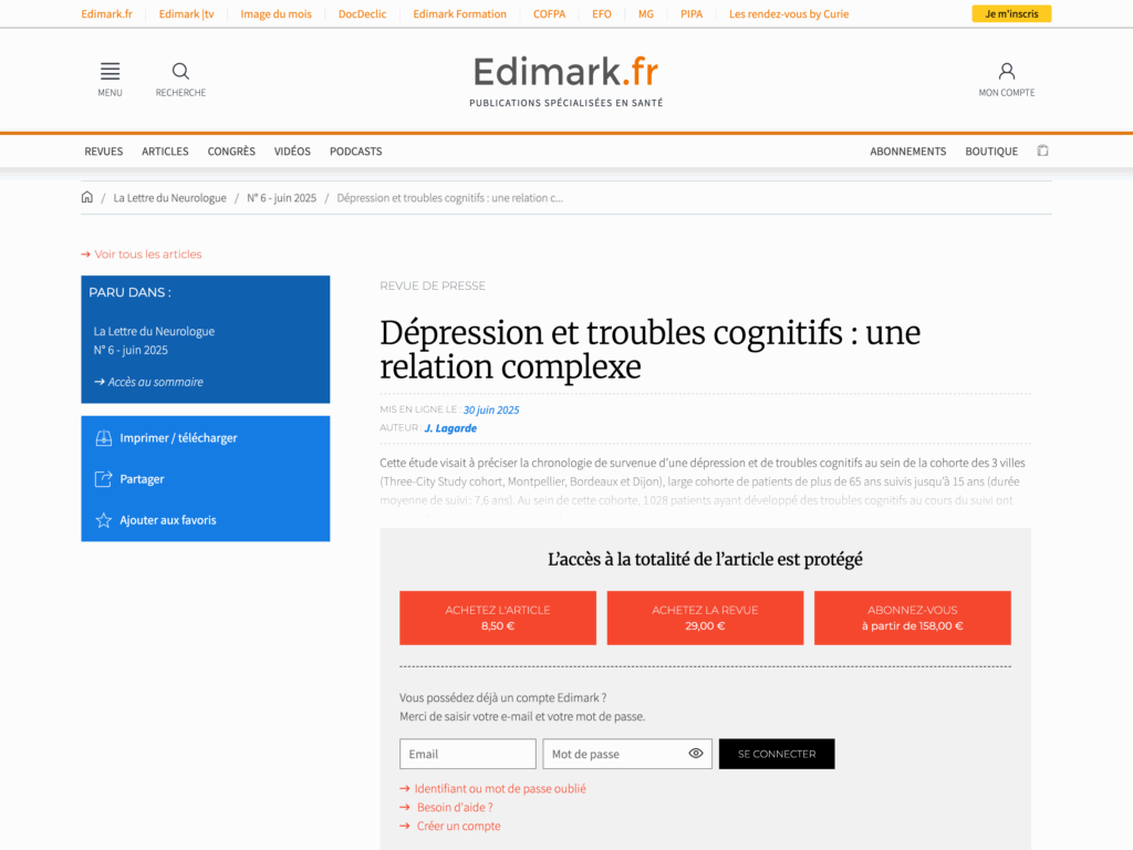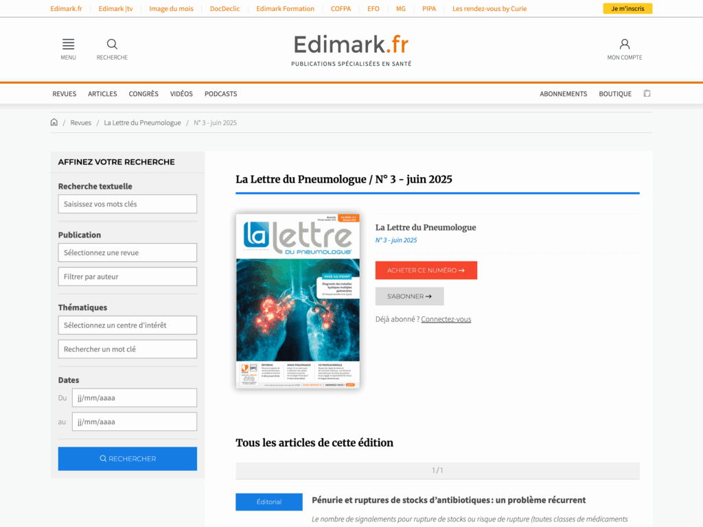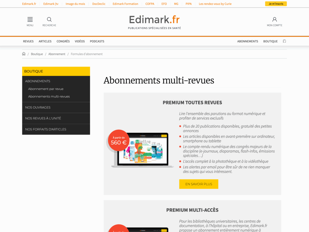 La particularité d’Edimark réside dans la variété de l’offre. En effet, en plus de la version numérique de leurs revues, il est possible depuis le site d’acheter des articles à l’unité ainsi que des ouvrages ou de souscrire à des abonnements uniquement web.