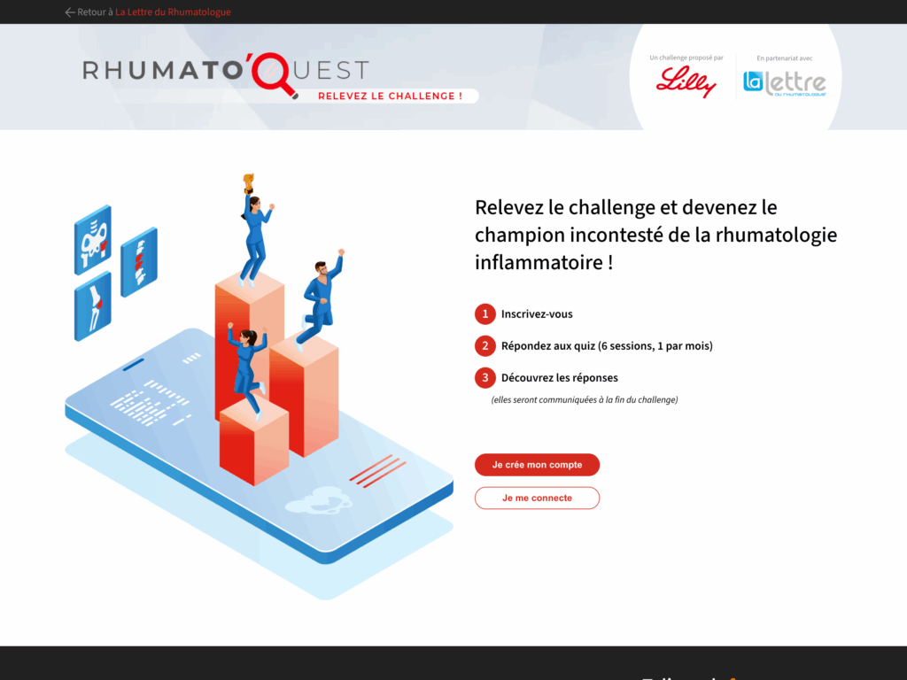 En partenariat avec le laboratoire Lilly, Edimark a lancé un challenge pour les professionnels de santé rhumatologues. Ce projet e-learning permet de répondre à plusieurs quiz et ainsi accéder à des resources éducatives.