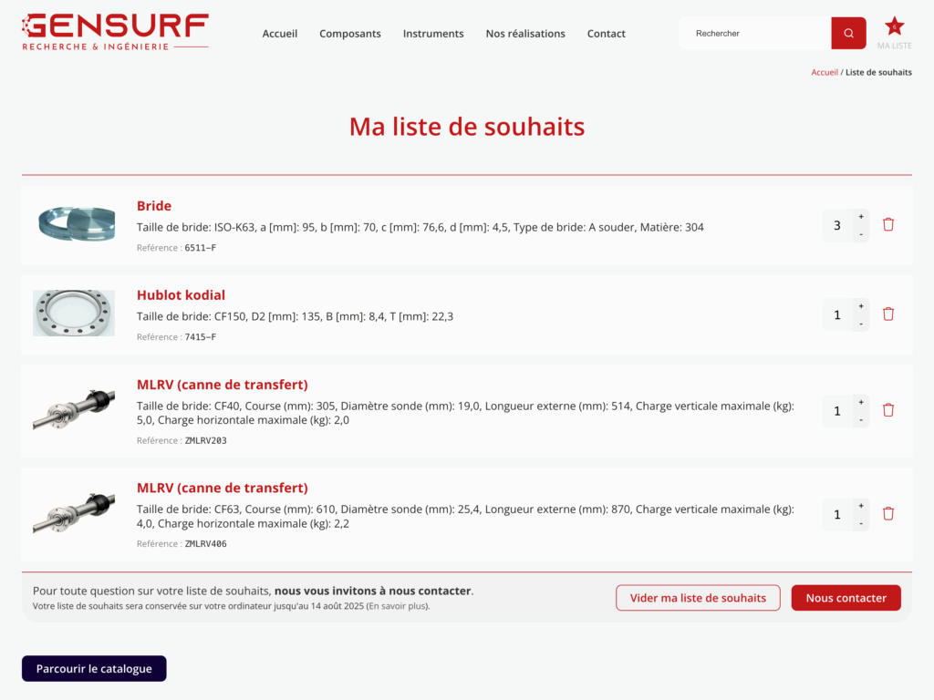 Nous avons ensuite intégré une option dans le formulaire de contact pour envoyer leur liste de souhaits en pièce jointe pour une demande de devis ou d’informations.