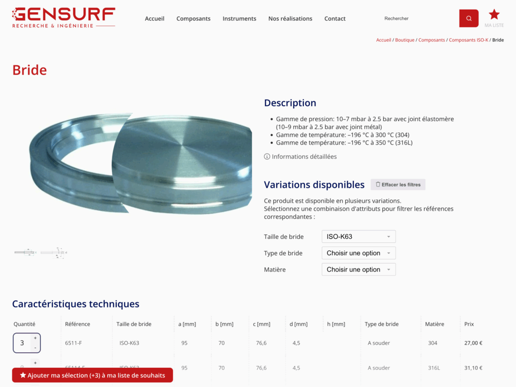 Pour cela, nous avons créé des fiches produits variables sur mesure. En effet, toutes les variations d’un produit sont rassemblées au sein de la même fiche sous forme de tableau. Les attributs permettent de filtrer rapidement les références et de les ajouter à la liste de souhaits des visiteurs.